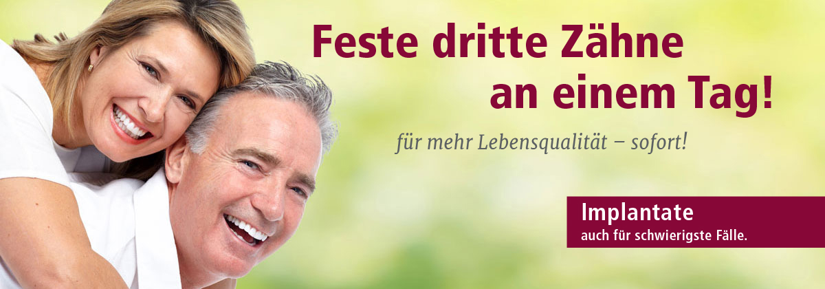Wir alle haben eine natürliche Sehnsucht nach Sicherheit mit gesunden und schönen Zähnen. Jeder möchte im Umgang mit seinen Mitmenschen unbeschwert lachen, sprechen und essen können. Leider ist das nicht allen Menschen von Natur aus gegeben. Wir haben es uns zum Ziel gemacht den Menschen, die durch verschiedenste Umstände keine oder nur noch wenige eigene Zähne haben, ein neues gutes Lebensgefühl zu ermöglichen. Schnell, unkompliziert und effizient, innerhalb eines Tages. Eine positive Ausstrahlung beginnt mit einem strahlenden Lächeln und ist für alle Lebensbereiche wichtig, um glücklich und erfolgreich zu sein. Informieren Sie sich und vereinbaren Sie einen unverbindlichen Beratungstermin oder besuchen Sie eine unserer regelmäßigen Informationsveranstaltungen. Wir freuen uns auf Sie!